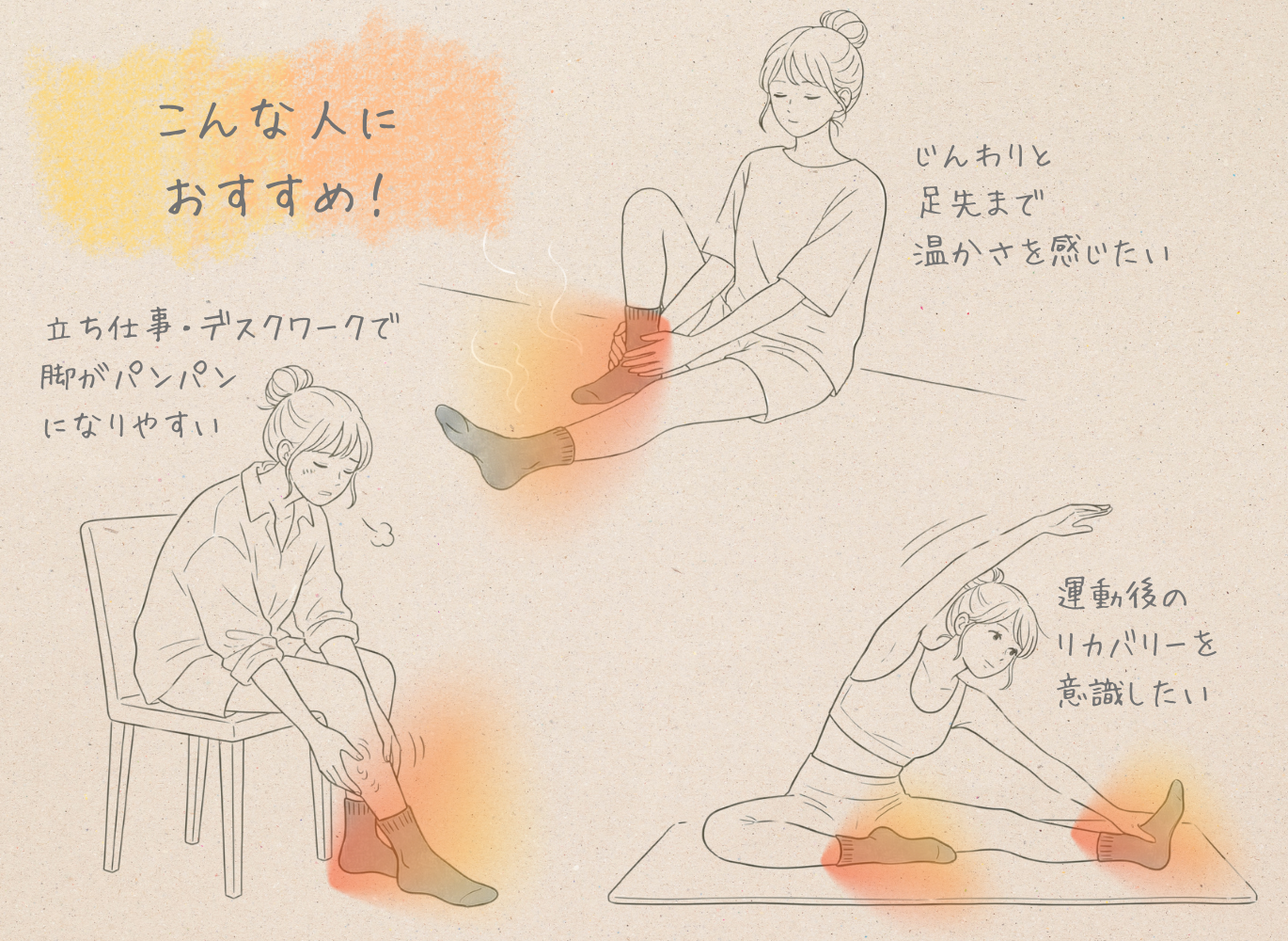 特別な動作や時間は不要。いつもの靴下を履き替えるだけで、コンディショニングをサポート。足は「第二の心臓」とも呼ばれるほどめぐりに大切な部位。その足元をIFMC.でケアすることで、全身のコンディションづくりにも一役買ってくれます。就寝前やおうち時間に履けば、1日の終わりの“ととのえ時間”を、より心地よく演出します。プロアスリートのリカバリーやバランス向上を目的としたウェアにも採用されている注目素材。日常の冷え対策はもちろん、トレーニングやウォーキング時のパフォーマンスケアにも◎。
