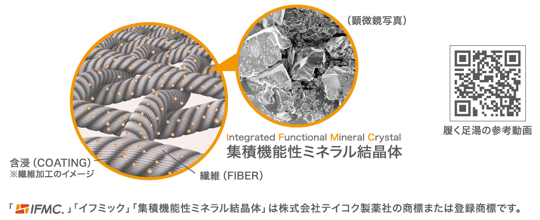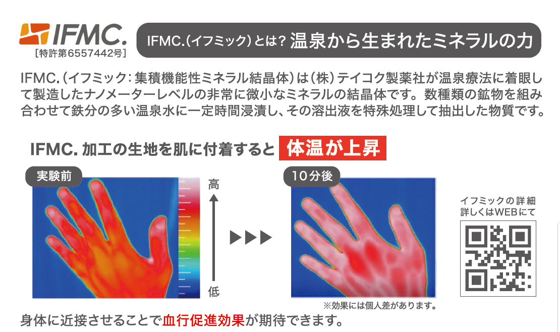 IFMC.は、数種類の鉱物を組み合わせ、鉄分を多く含む温泉水に一定時間浸し、その溶出液を特殊な方法で処理・抽出してつくられた、ナノレベルのミネラル結晶体。この結晶体を繊維に加工することで、「身につけるだけ」でカラダにうれしい変化が期待できる新発想のマテリアル。IFMC.は肌に触れるずとも近づくだけで、血管の内側からつくられる一酸化窒素(NO)が増えやすくなり、血管がゆるみ、広がりやすい状態に。その結果、血行が促進され、めぐりのサポートが期待できます。
