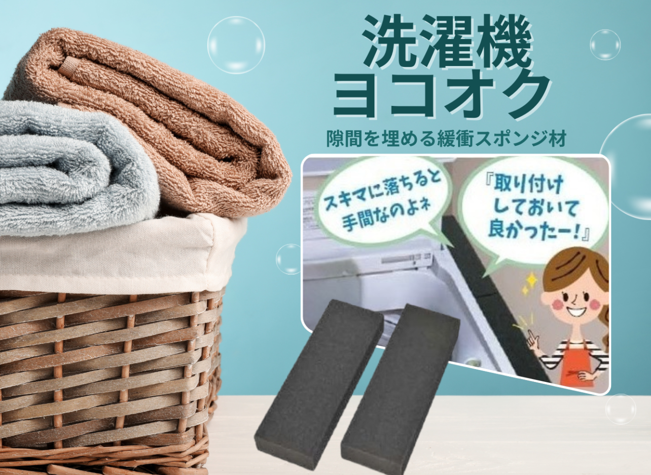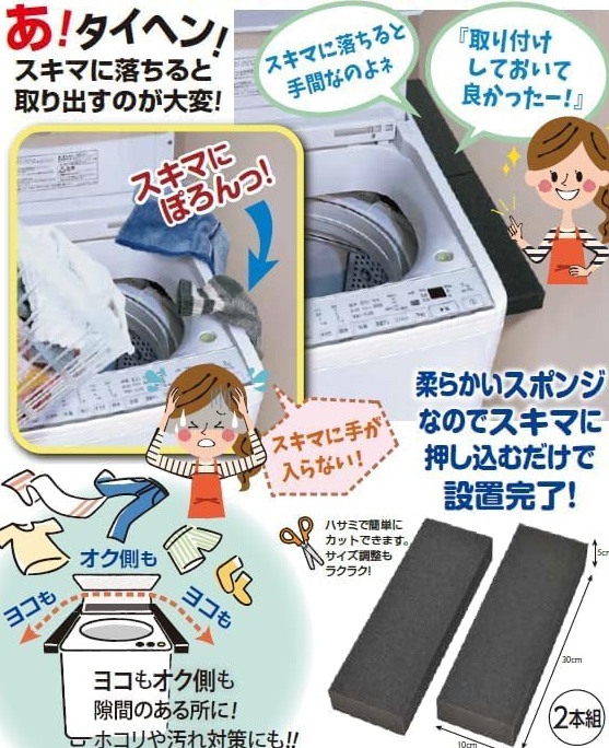 適度な弾力のある特殊ウレタンスポンジが、隙間にピタッとフィット。洗濯機の激しい振動でもズレにくく、小物の落下をしっかりガードします。もう「見えているのに手が届かない!」とイライラすることはありません。 -